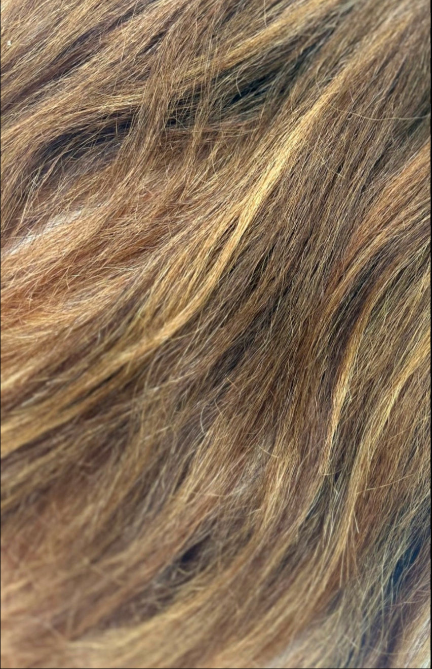 This dimensional mix features light brown roots that melt into golden caramel tones with ash blonde ribbons for a sun-warmed, multi-tonal glow. A soft, radiant blend that brightens textured strands without overpowering.